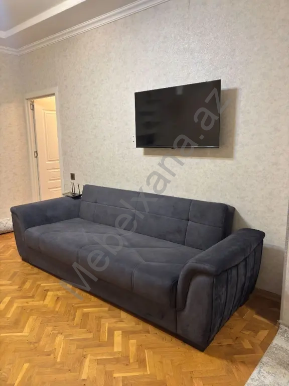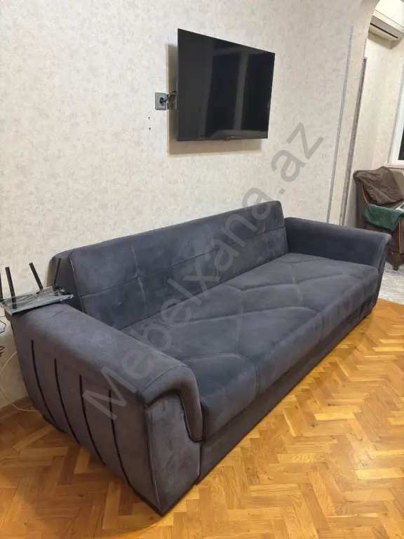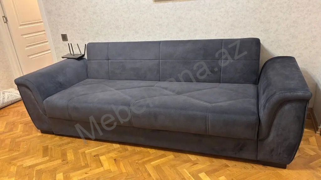 Tünd boz rəngli, yumşaq süet-mat parça ilə üzlənmiş geniş üçnəfərlik divan.