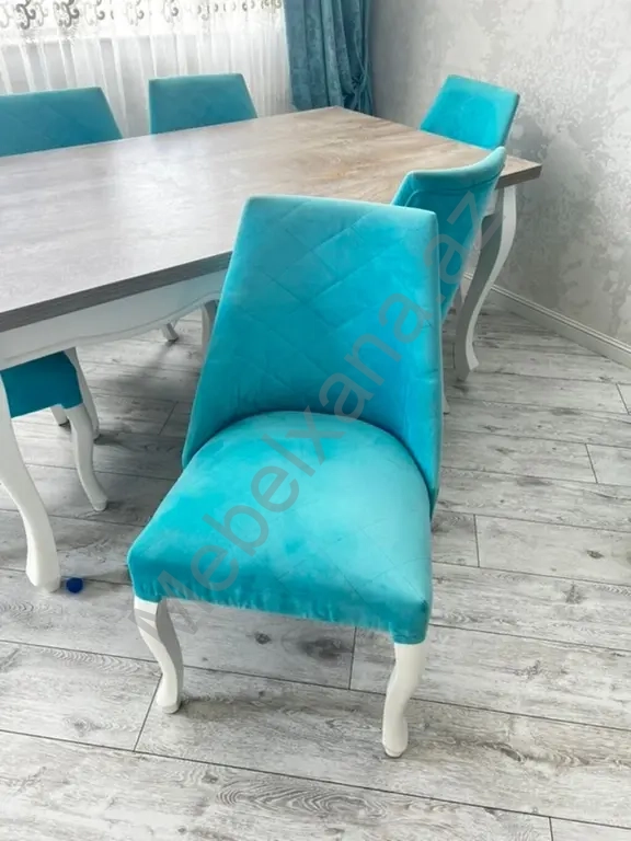 - Stullar: 6 ədəd, turkuaz rəngli məxmər/velur tipli parçayla üzlənmiş yumşaq oturacaq və bel hissəsi. Səthdə rombvari tikiş detalı. Ağ rəngli, klassik əyri ayaqlar masanın dizaynı ilə uyğunlaşır.