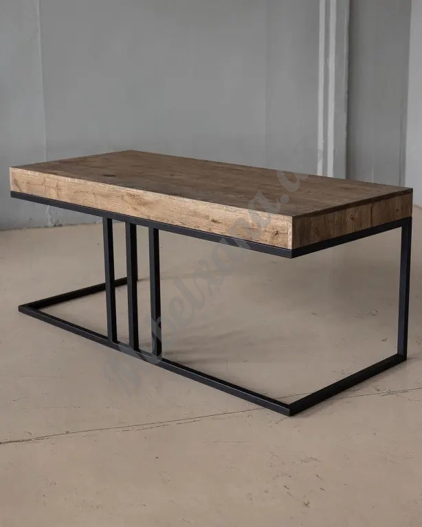 Sənaye üslubunda mebel dəsti – metal çərçivəli qəhvə masası və açıq rəf sistemi